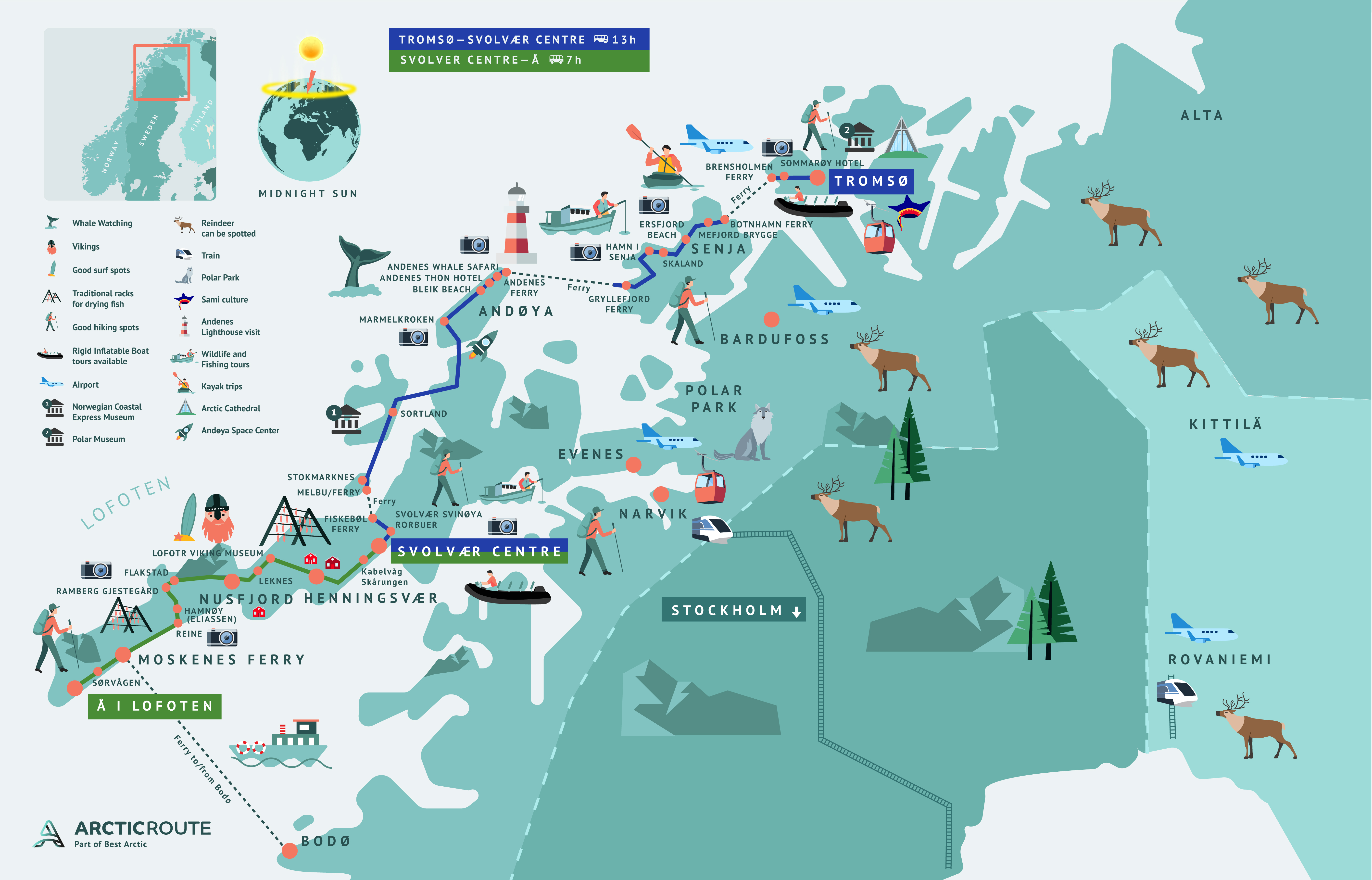 La Artic Route es una ruta por una de las zonas más espectaculares de Noruega que se puede disfrutar cómodamente sentado en un autobús. Esta ruta realiza paradas en los lugares de interés y puedes ir subiendo y bajando a tu ritmo. Puedes quedarte en alguna parada para hacer noche en un hotel y realizar alguna actividad en la naturaleza. En esta zona de Noruega se pueden contratar safaris para ver ballenas, salidas en bici, tours en kayac y senderismo.